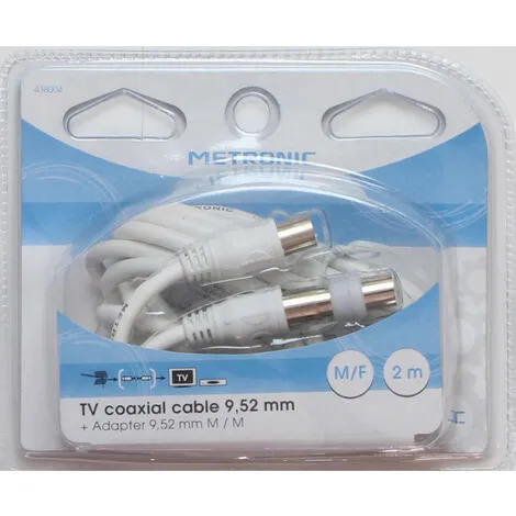 METRONIC Câble TV Coaxial 9,52 Mm Coudé Mâle/fem. + Adaptateur 9,52 Mm 2 M – Blanc – Blanc